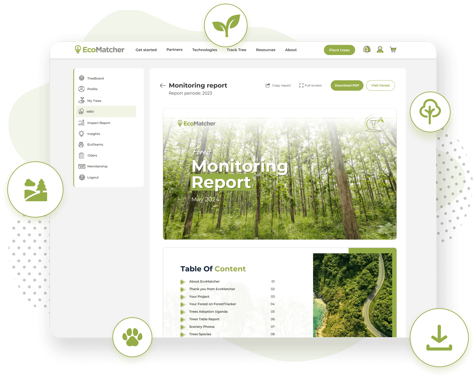 EcoMatcher provides comprehensive, standardized monitoring reports for customer tree-planting initiatives, replacing ad hoc, on-demand updates with